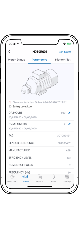 You can edit the motor details by selecting a motor in the mobile app: you will land on the Motor Status tab. Tap Edit motor at the top right corner: you will be able to add any missing parameter and confirm your changes.